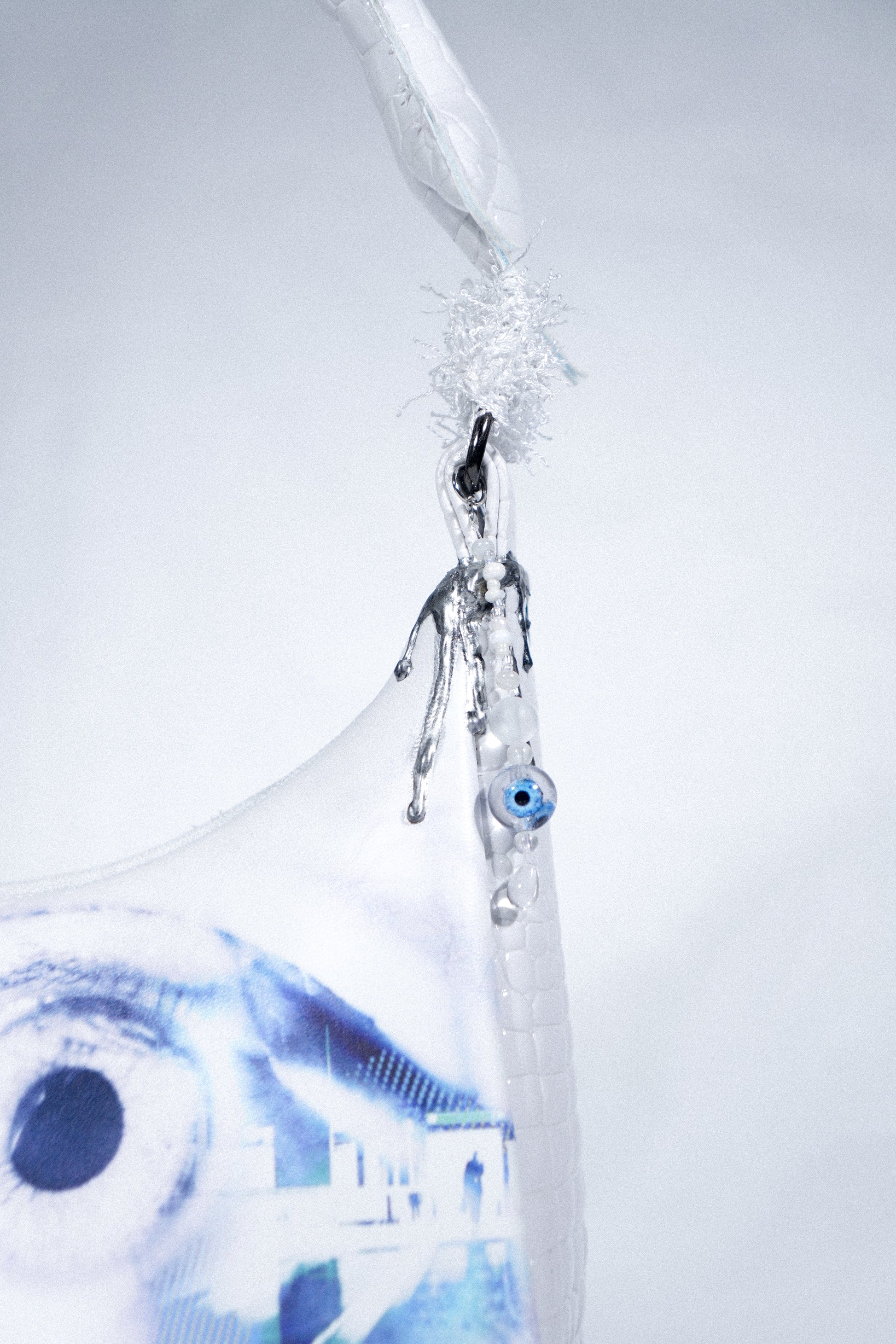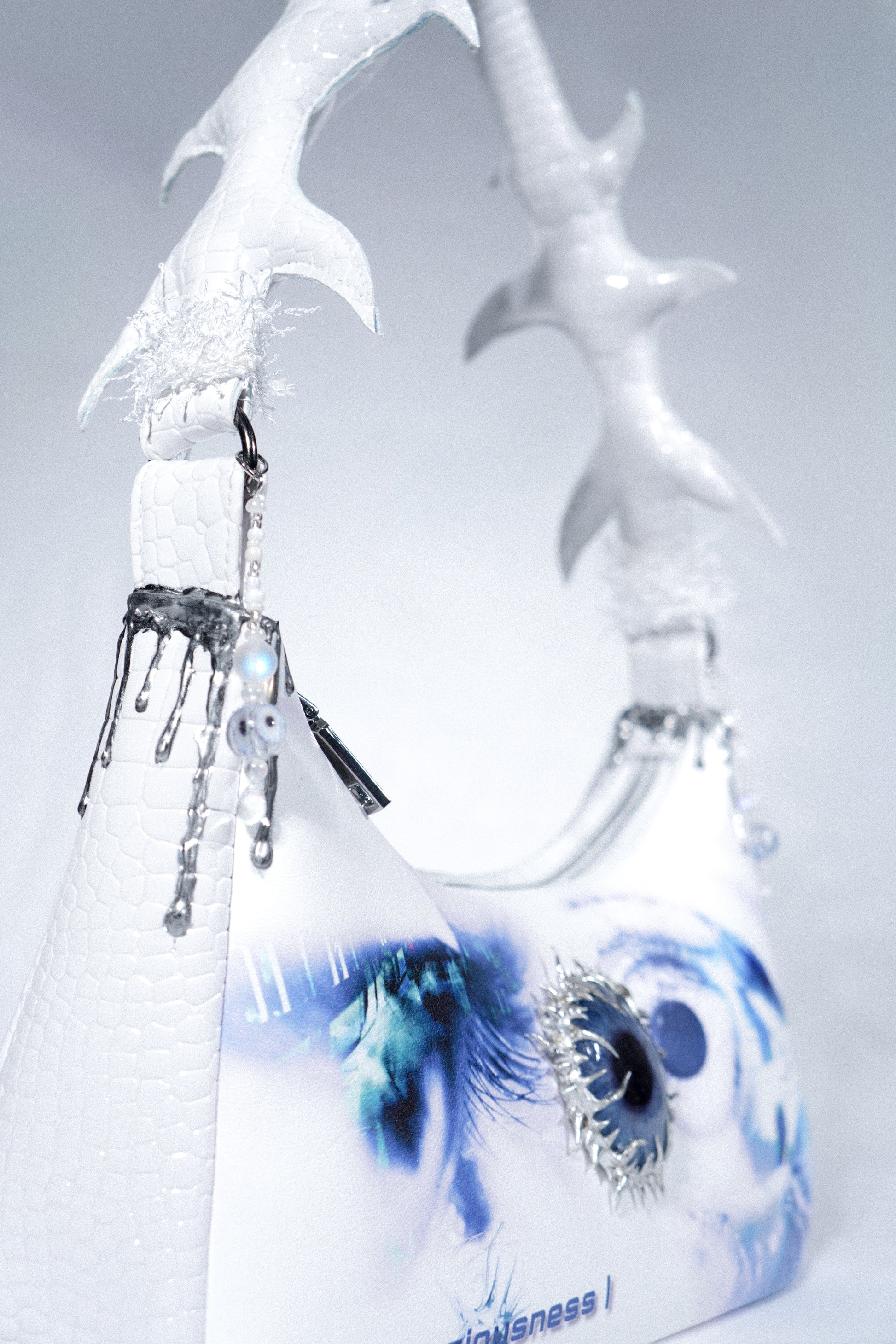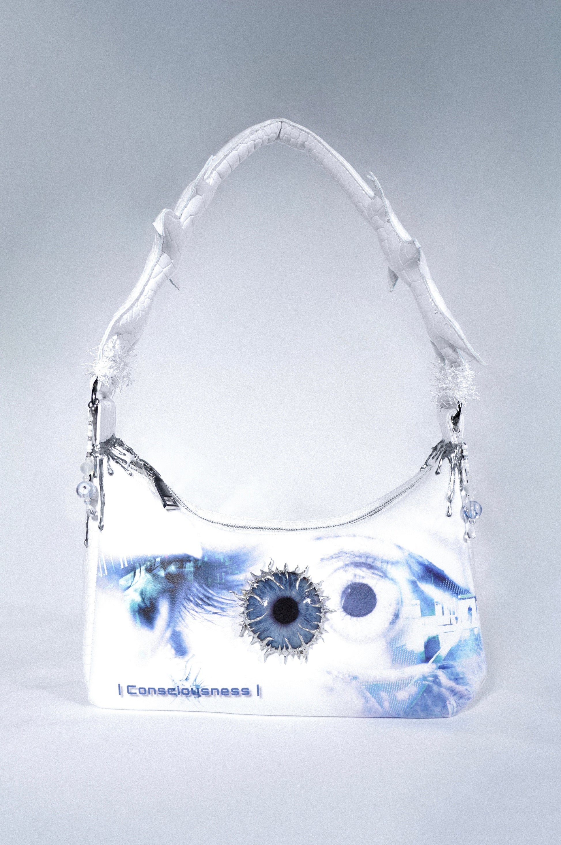 The front graphic depicts an eye layered with surreal imagery symbolizing open eyes and gained consciousness. At the center of the purse is a sculpted, hand-cast eye with soldered edges forming a spiked design around it. The edges of the purse are detailed with silver-toned 3D fabric paint for a textured, cast-like effect. Handmade eye charms add a unique touch. The interior features a white lining with a small open pocket. At the bottom of the purse spells out, "CHAERI".