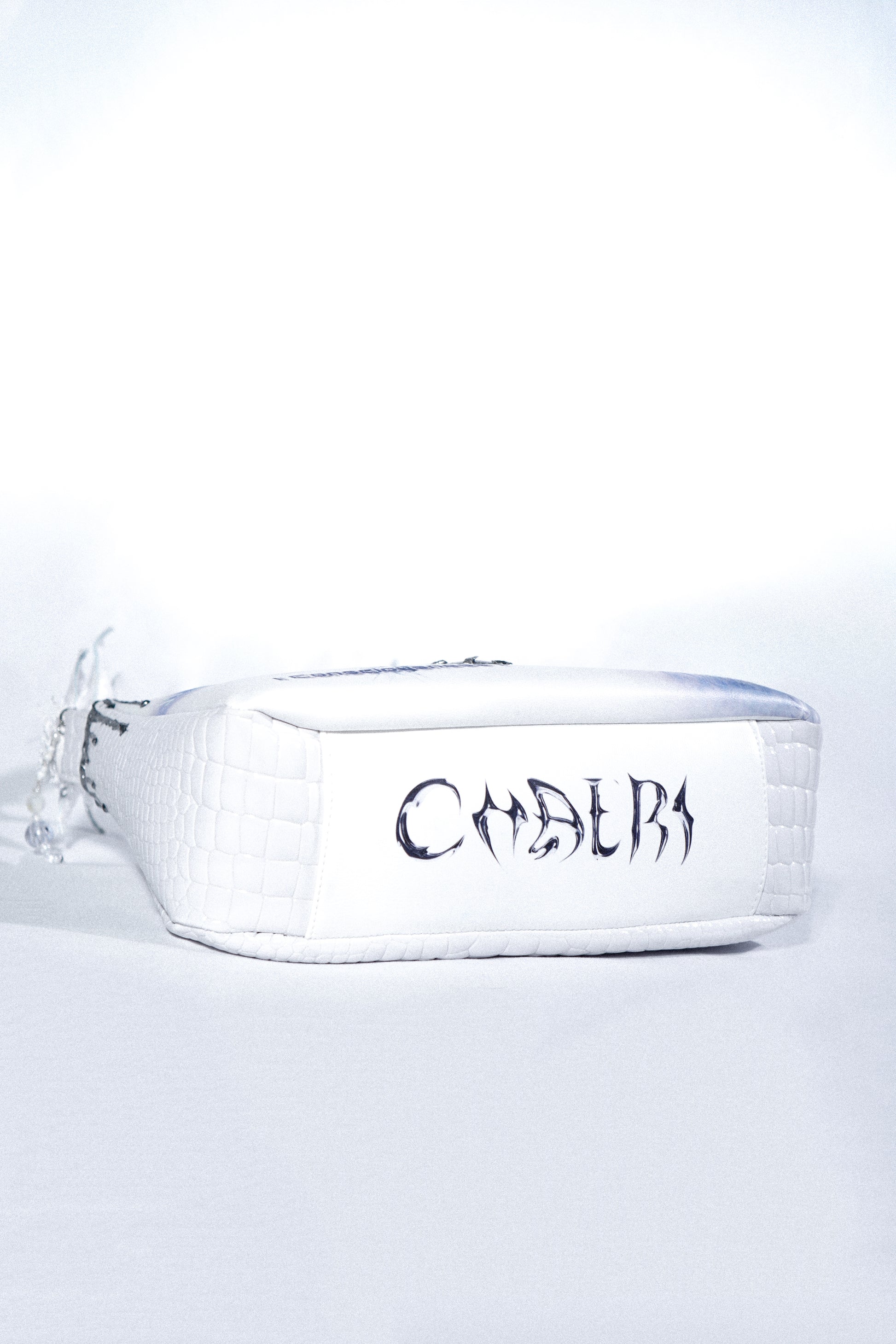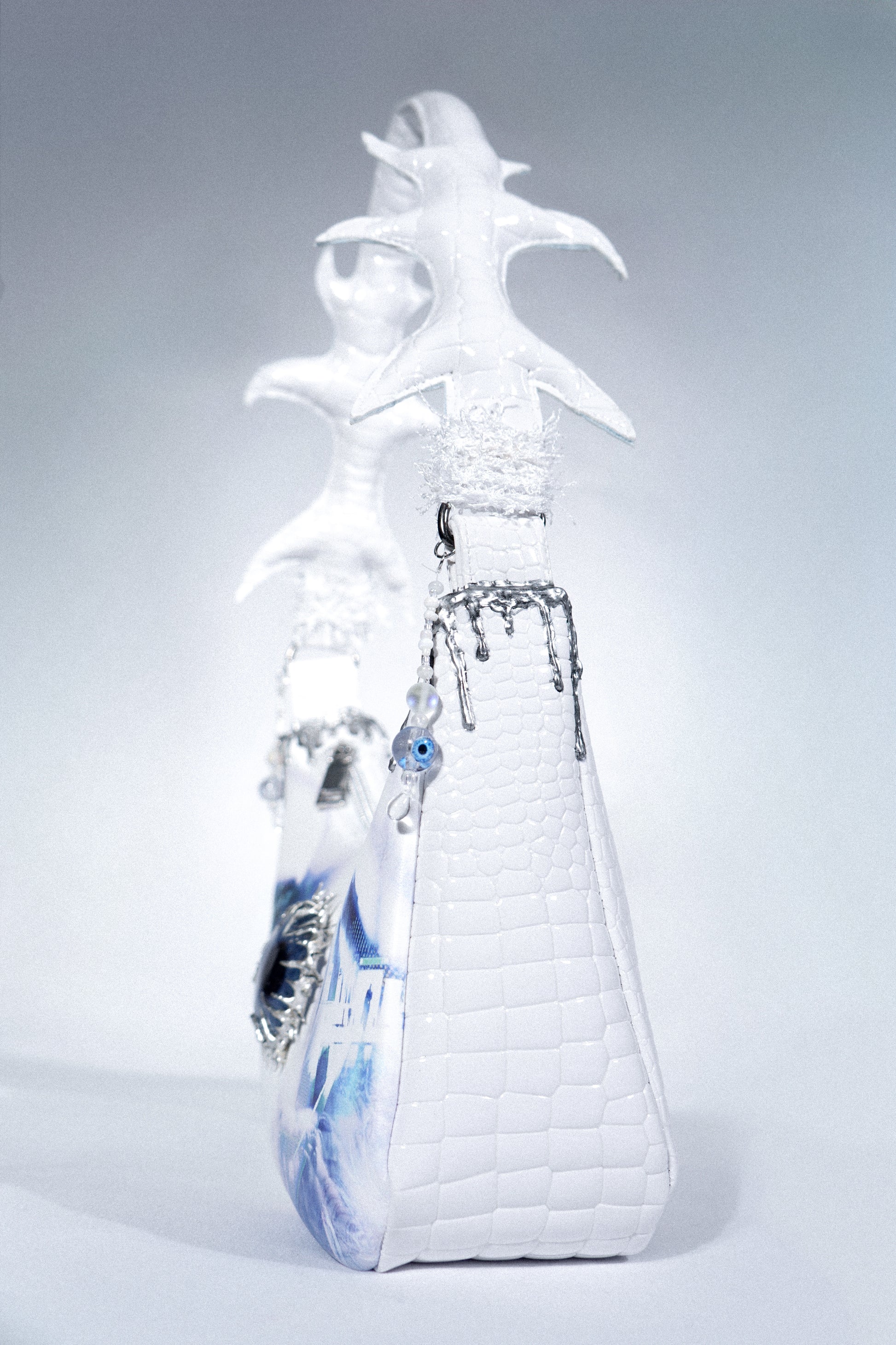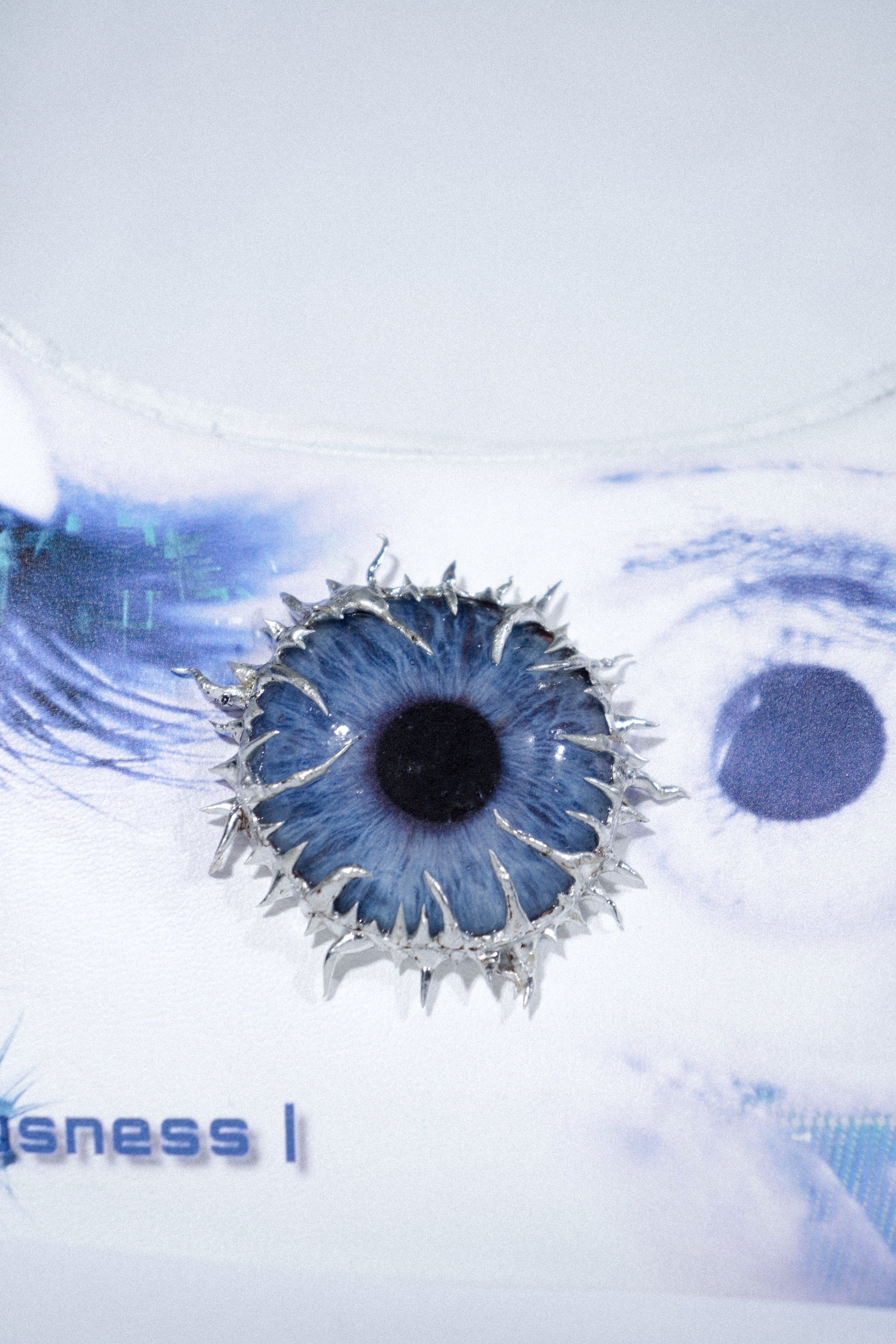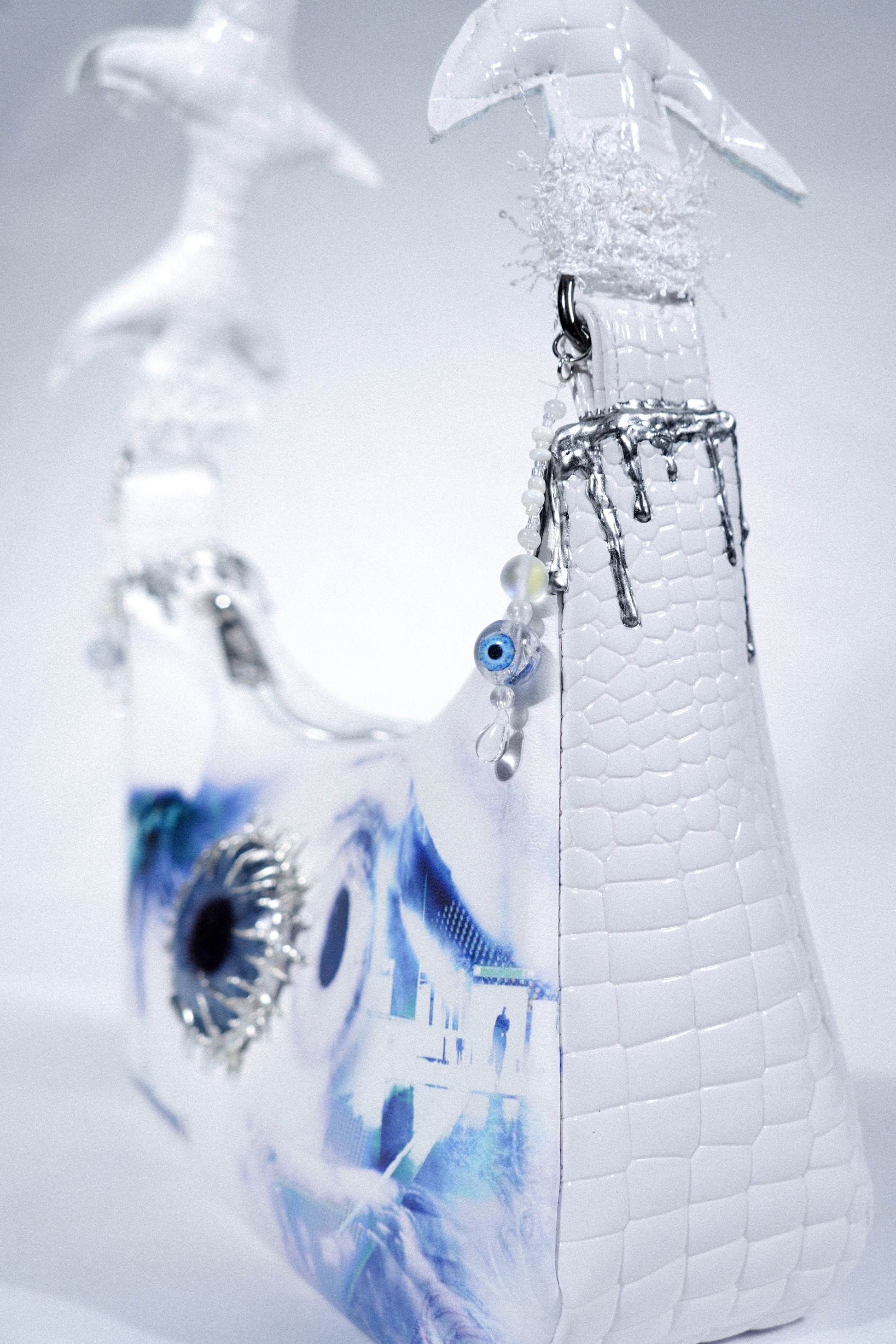 The front graphic depicts an eye layered with surreal imagery symbolizing open eyes and gained consciousness. At the center of the purse is a sculpted, hand-cast eye with soldered edges forming a spiked design around it. The edges of the purse are detailed with silver-toned 3D fabric paint for a textured, cast-like effect. Handmade eye charms add a unique touch. The interior features a white lining with a small open pocket. At the bottom of the purse spells out, "CHAERI".