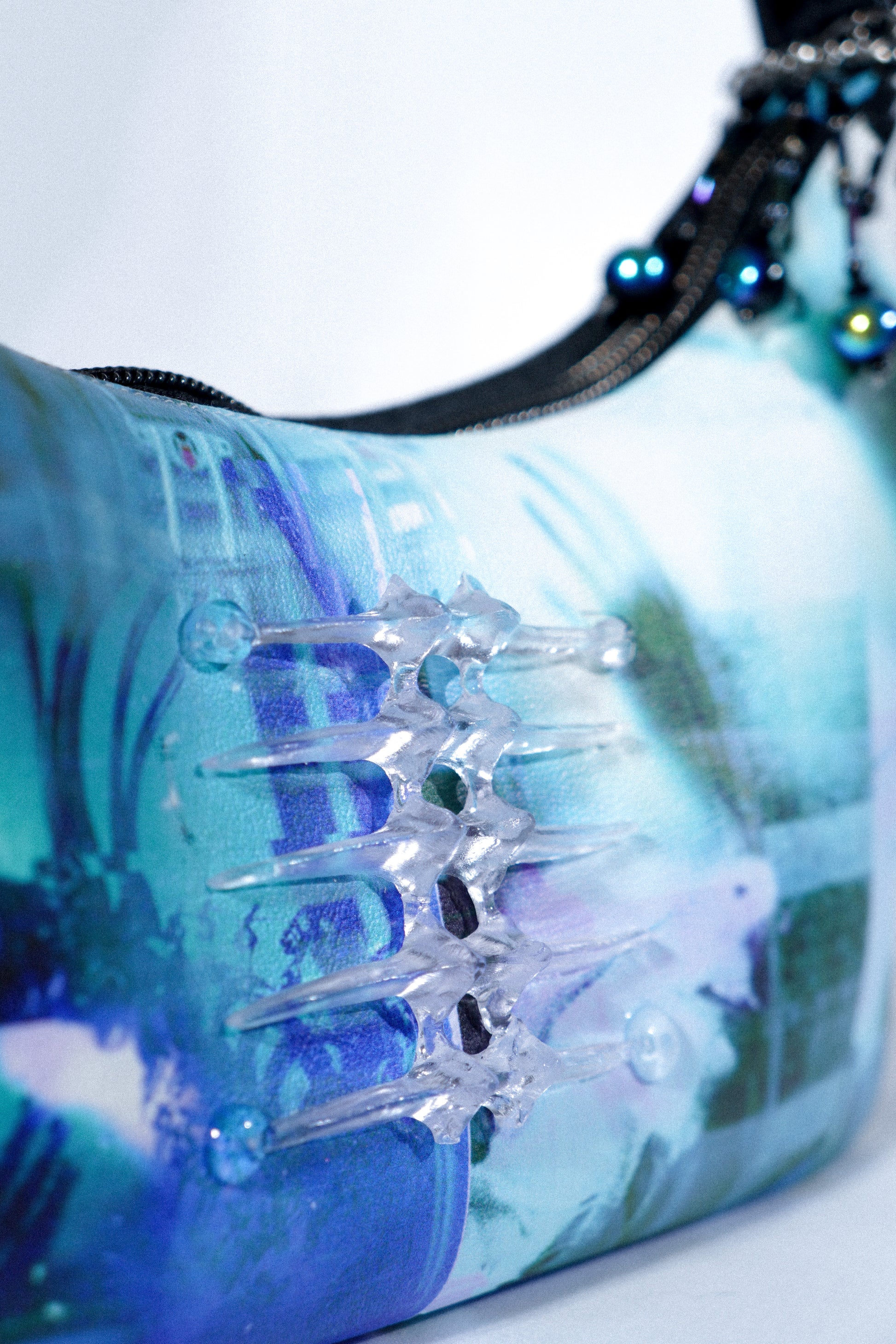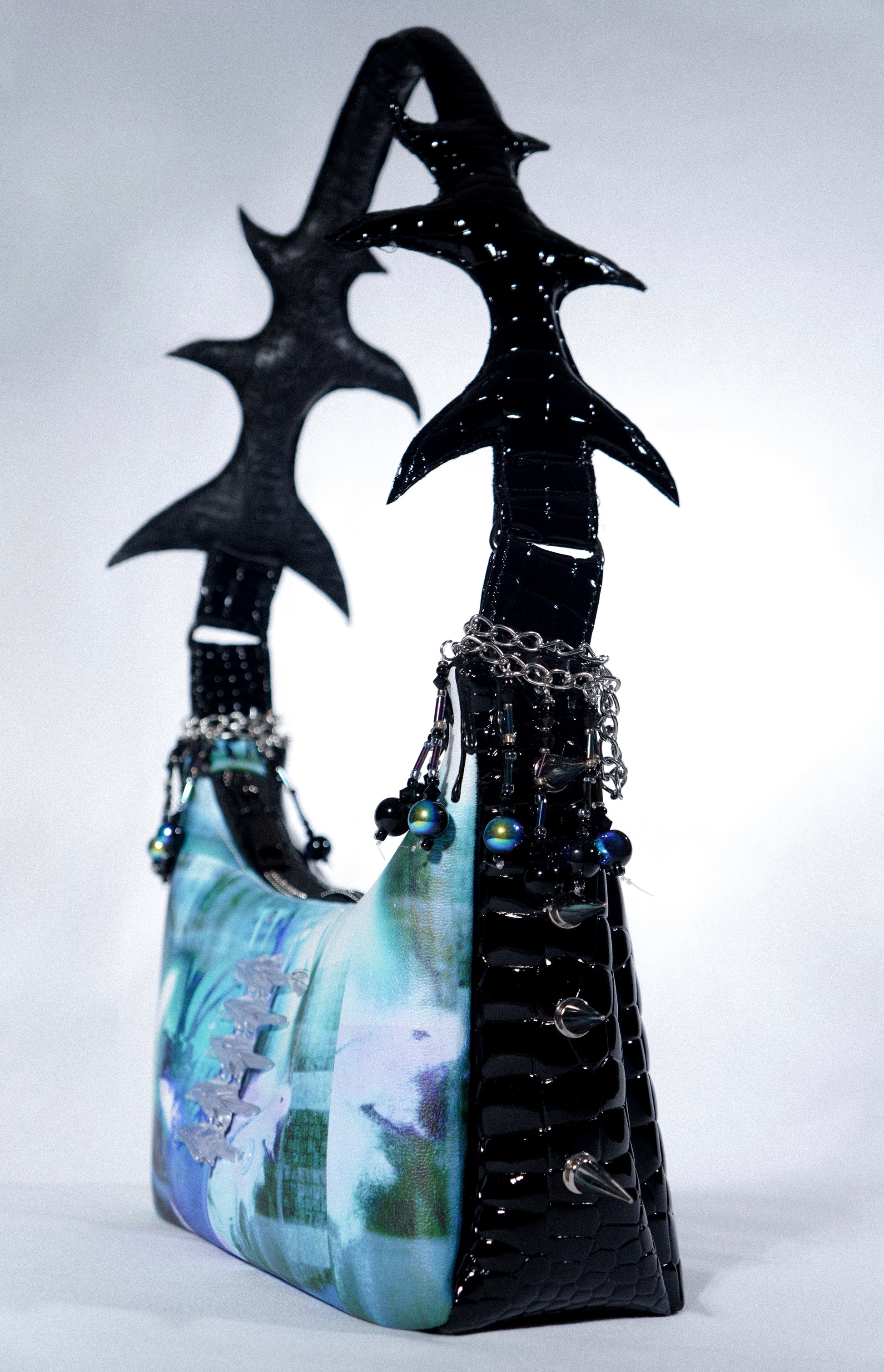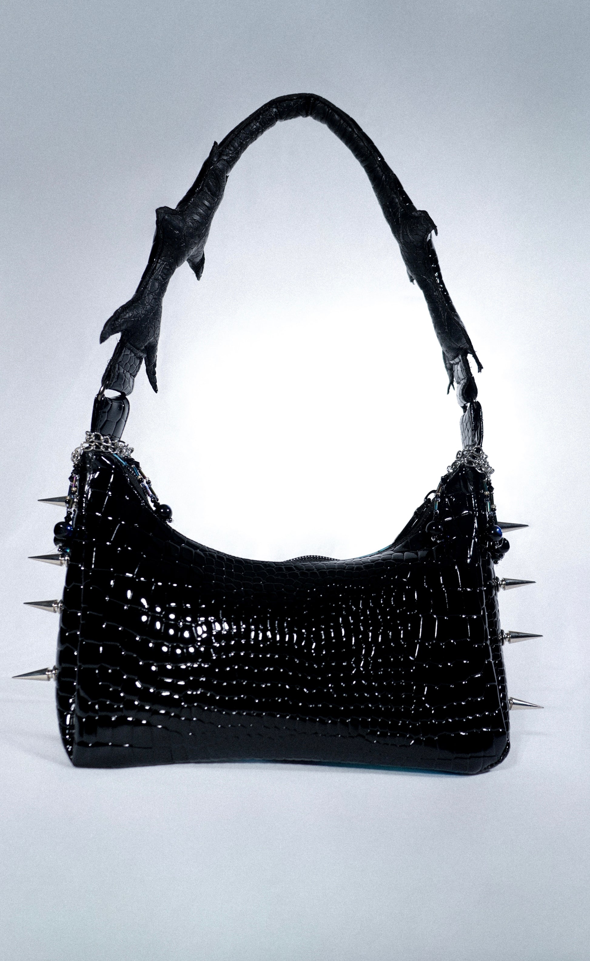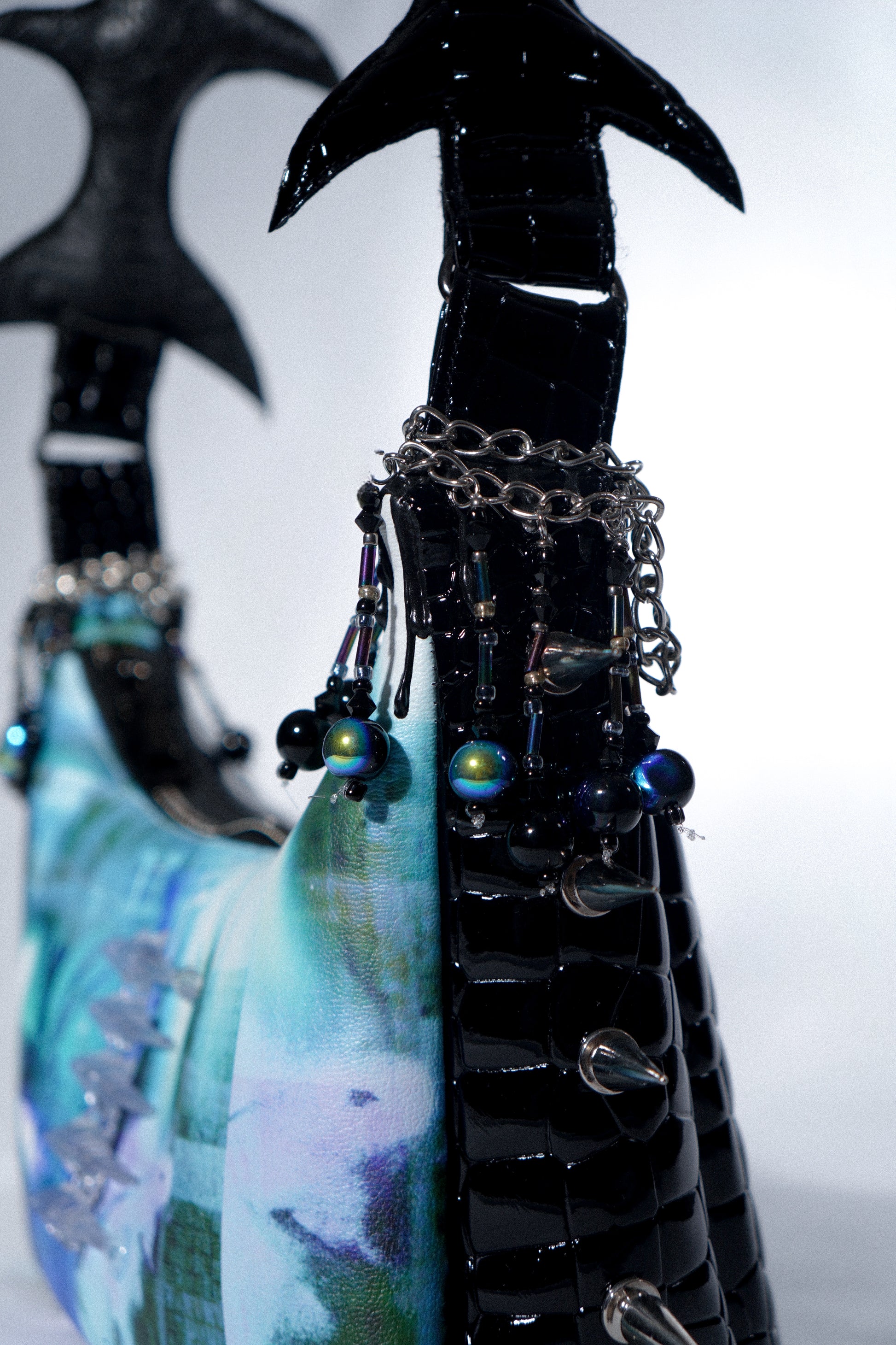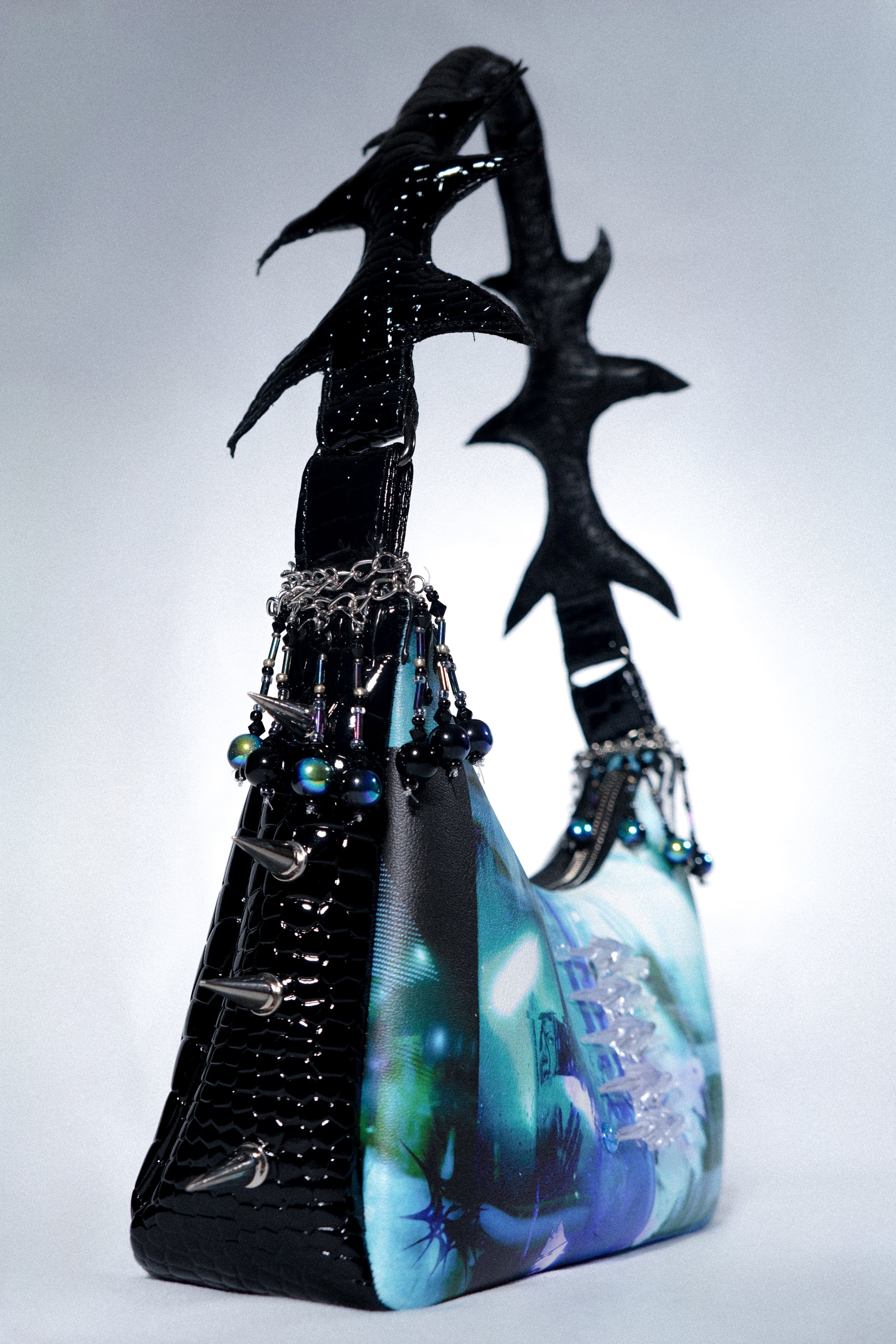 The front features a graphic with a sculpted, cast spine-like design. Spiky studs are screwed onto the sides of the purse. A chain with dangling beads is wrapped around the handles. The interior lining is black with a small open pocket.