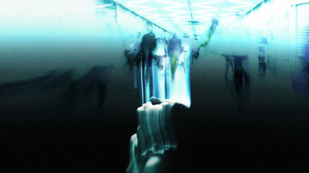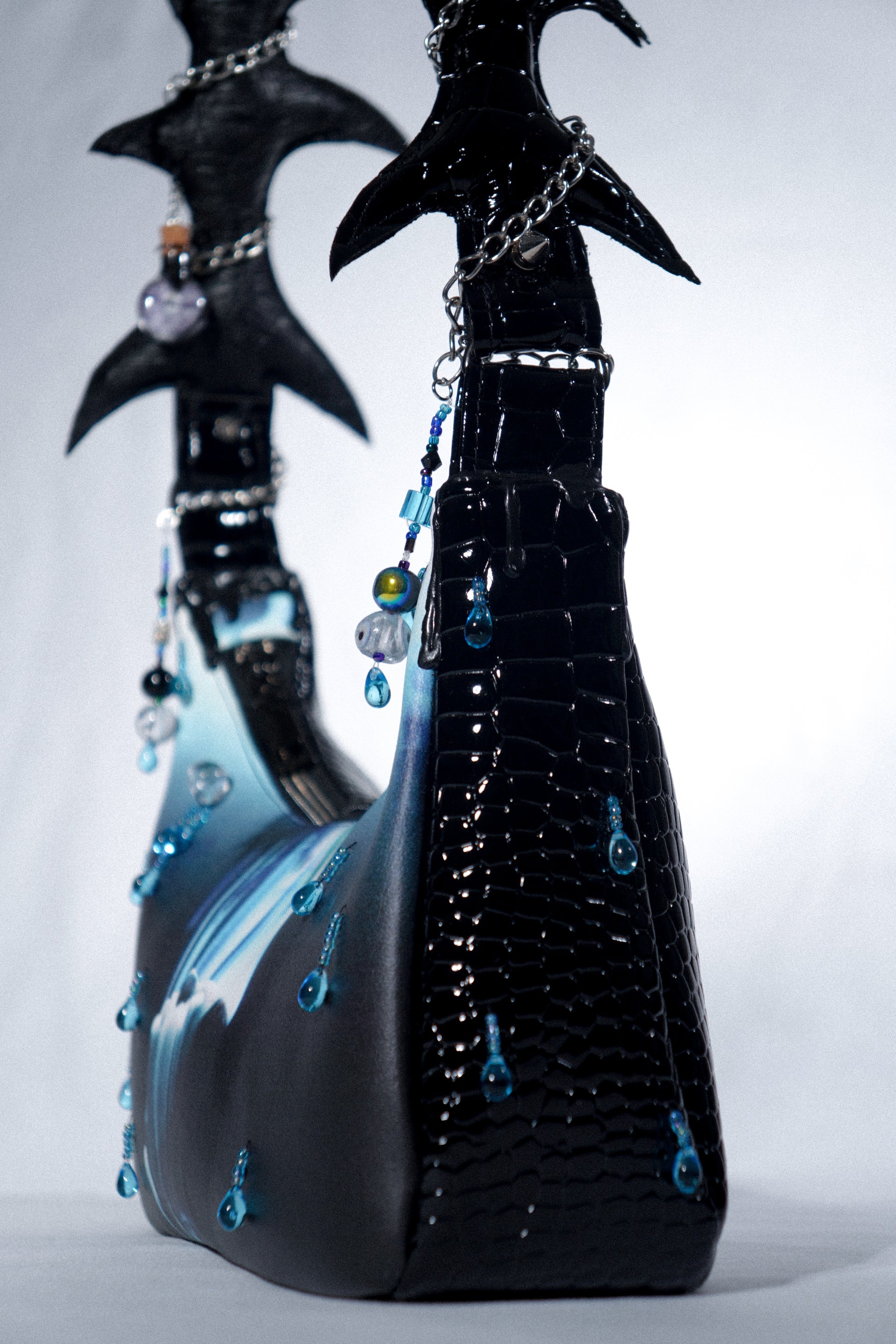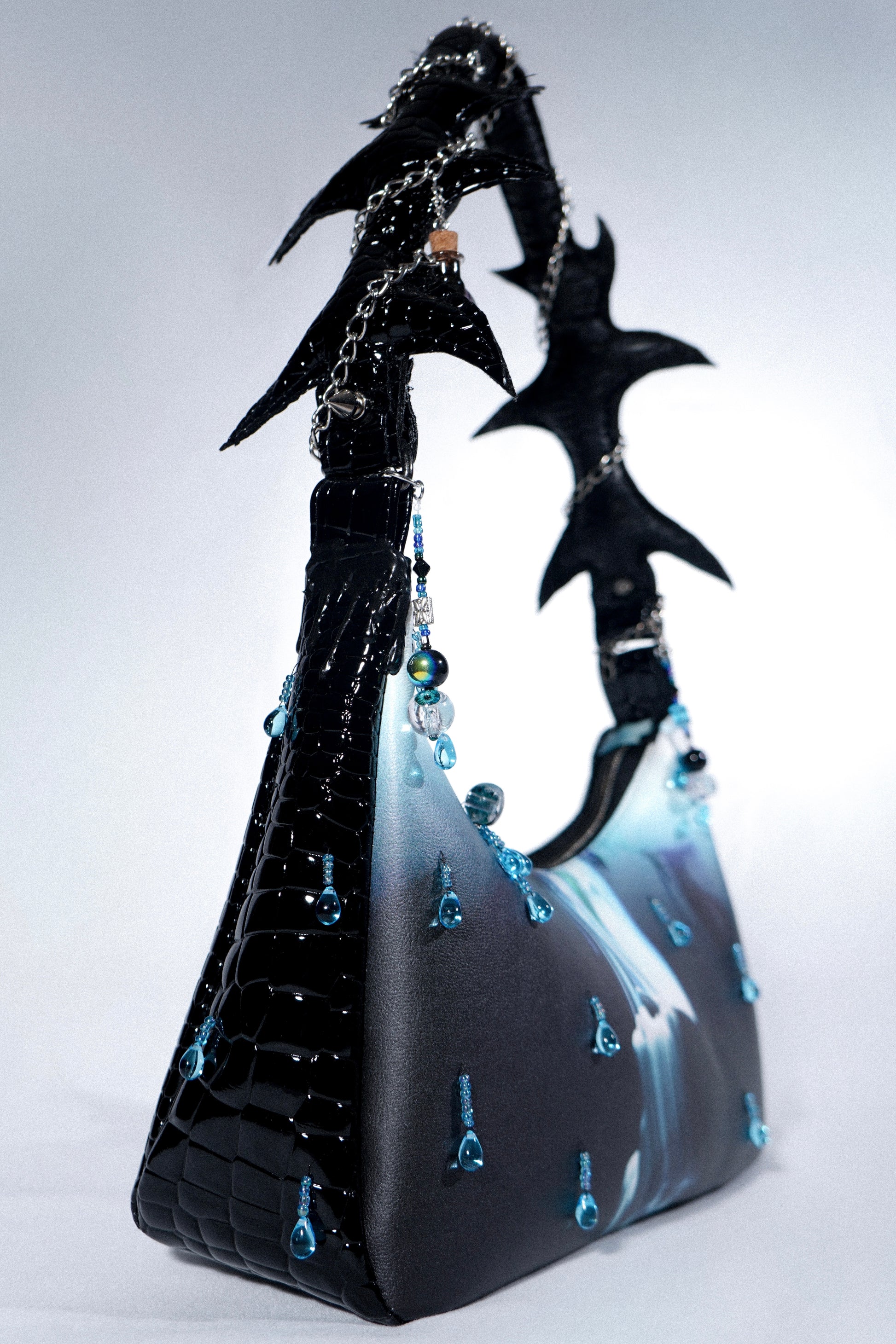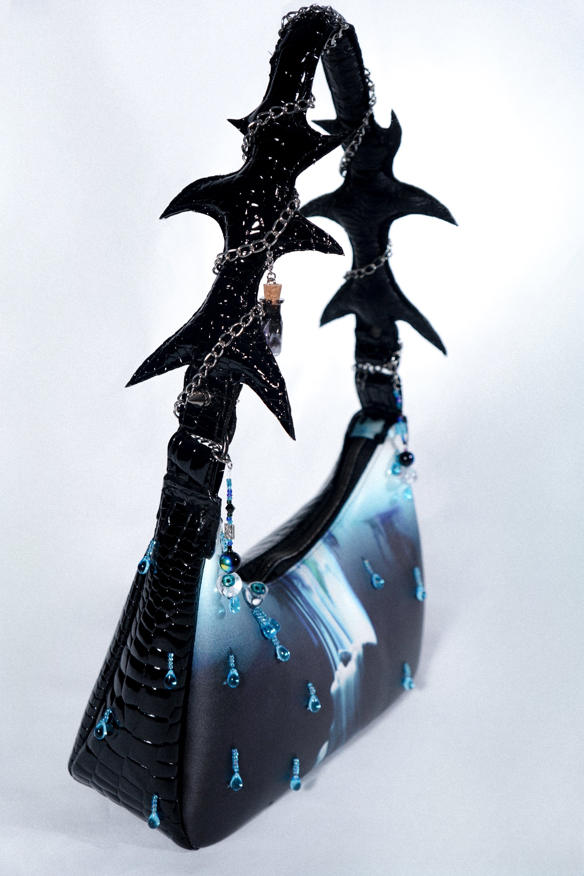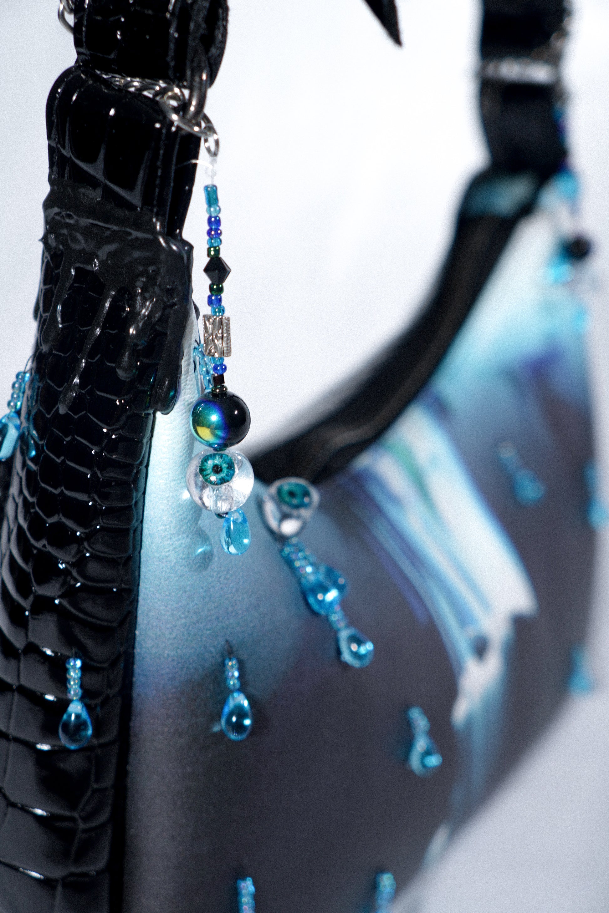 Blue beaded strands and handmade eye beads cascade across the front of the bag, drawing attention to a powerful visual narrative.The graphic captures a surreal moment, the essence of a person separating from their body, projecting their internal world into the physical.