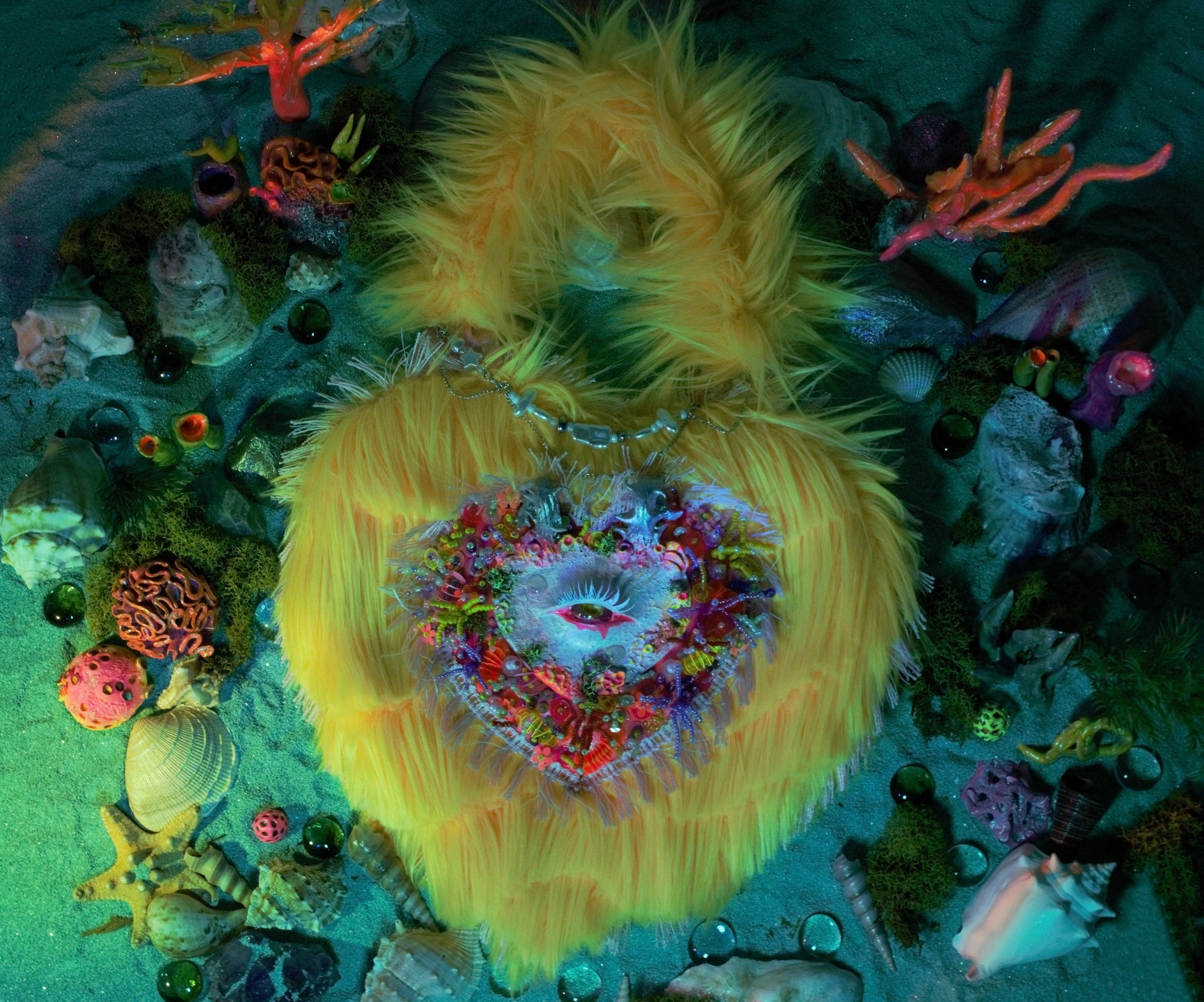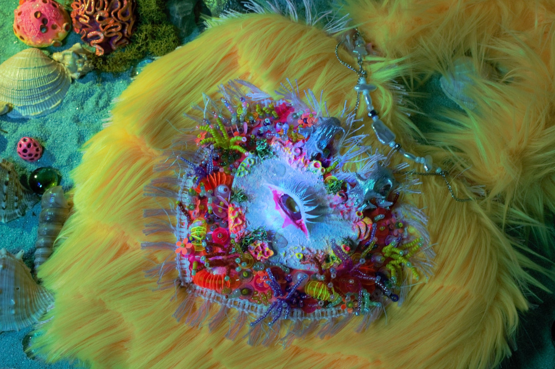 Bright yellow handbag featuring a sculpted eye at the center, radiating with a vivid yellow gaze. Surrounding the centerpiece are hand-beaded strands resembling coral reefs and protruding sculpted horns. Above, a sorted freshwater bead chain is hooked onto the handle. The bag is trimmed carefully into a wave-like pattern for added movement and texture.